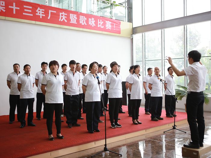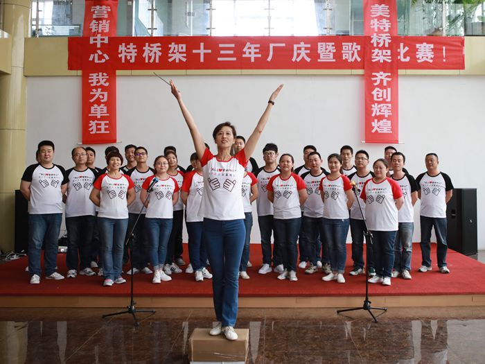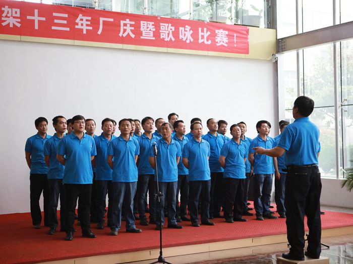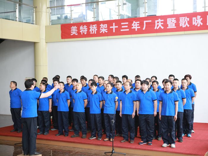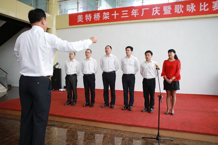 總經理孫保建做了簡短的開場致詞。緊接著輥壓工段代表隊、塔沖工段代表隊、熱鍍鋅車間代表隊、焊接工段代表隊、職能部門代表隊,營銷中心代表隊和生產后勤代表隊依次登臺演唱廠歌--《騰飛吧,美特!》