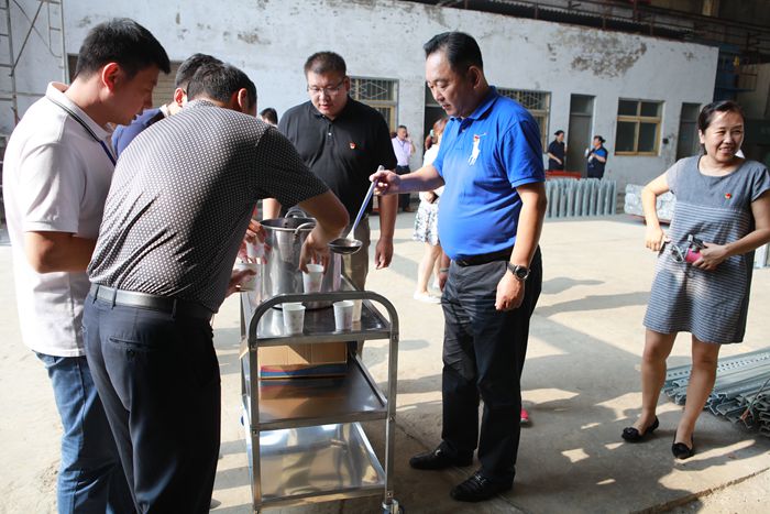 在董事長尚新春同志的帶領下,生產副總孫保建、財務總監姜雪梅以及全體黨員和入黨積極分子一起深入生產一線,為車間工人送愛心;一支支冰涼的雪糕,吃在工人的嘴里,暖在工人的心中;一杯杯解暑的綠豆湯,傳遞著黨員對工人的關心。
