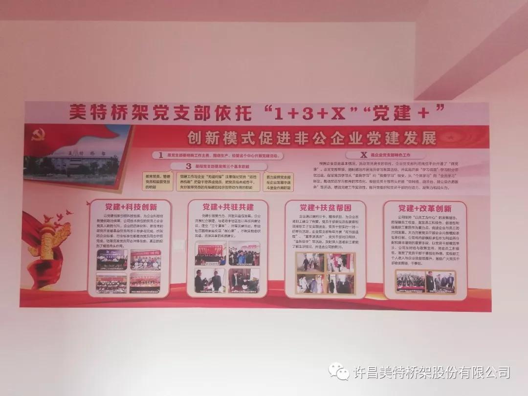 許昌美特橋架股份有限公司成立于2003年前身是許繼集團子公司的沖壓分廠,現在是集科研,生產,銷售,服務為一體的電纜橋架專業化生產基地,也是國內電纜橋架行業上市企業。美特橋架黨支部原隸屬許繼電氣黨支部,于2009年10月獨立設立了黨支部,現有黨員16名,流動黨員12名,發展入黨積極分子8名,覆蓋在企業的各個崗位上。近年來,公司本著“圍繞經營抓黨建、抓好黨建促發展”的工作理念,在開發區黨工委的帶領下,立足實際,持續在組織引領、隊伍建設、激發活力上探索創新,不斷深化黨建和業務融合互促。 現在是國內規模較大,技術先進,業務服務最廣泛的電纜橋架生產企業,也是國內電纜橋架行業首家上市企業,美特橋架黨支部原隸屬許繼電氣黨支部,于2009年10月獨立設立了黨支部,現有黨員16人,流動黨員12名,發展入黨積極分子8人,覆蓋在企業的各個崗位上,有效的增強黨員的模范帶頭作用,黨支部把學習貫徹習近平新時代中國特色社會主義思想貫穿于全部黨建工作的始終,進一步統一黨員思想,努力建設一個充滿活力、求真務實、敢于擔當、勇于創新的黨支部,著力打造一支顧大局、識大體、講團結、勤工作、肯奉獻、愛進取的黨員隊伍。